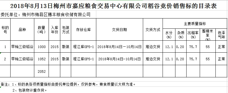 受客戶委托,梅州市嘉應(yīng)糧食交易中心有限公司定于2018年8月13日(星期一)舉辦糧食競(jìng)價(jià)交易會(huì),梅州市梅縣區(qū)穗豐糧食收儲(chǔ)有限公司擬銷(xiāo)售2015年早秈稻2052噸。