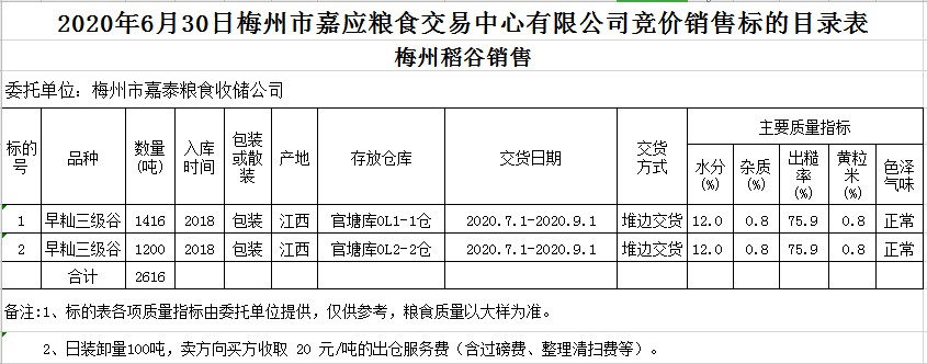 受客戶委托,梅州市嘉應(yīng)糧食交易中心有限公司定于2020年6月30日(星期二)舉辦糧食競價(jià)交易會,梅州市嘉泰糧食收儲公司擬銷售2018年早秈稻2616噸。