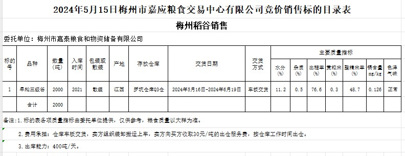 受客戶(hù)委托,梅州市嘉應(yīng)糧食交易中心有限公司定于2024年5月15日(星期三)舉辦糧食競(jìng)價(jià)交易會(huì)。梅州市嘉泰糧食和物資儲(chǔ)備有限公司擬銷(xiāo)售2021年產(chǎn)早秈稻2000噸。
