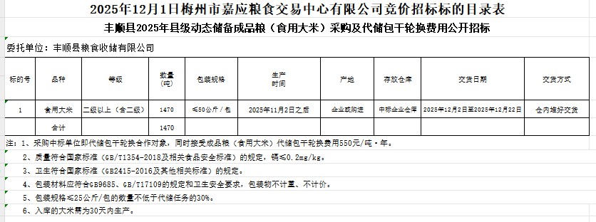豐順縣2025年縣級動態(tài)儲備成品糧(食用大米)采購及代儲包干輪換費用公開招標公告